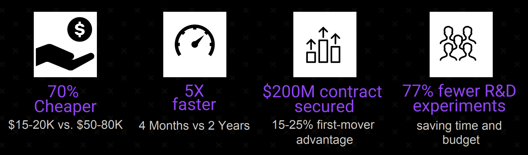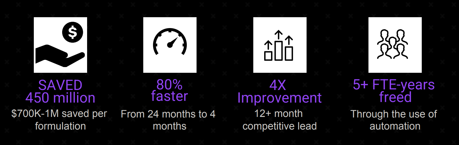 The result: transformative materials innovation delivered as a turnkey service - months instead of years, costing millions (USD) instead of hundreds of millions (USD).
